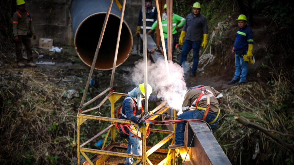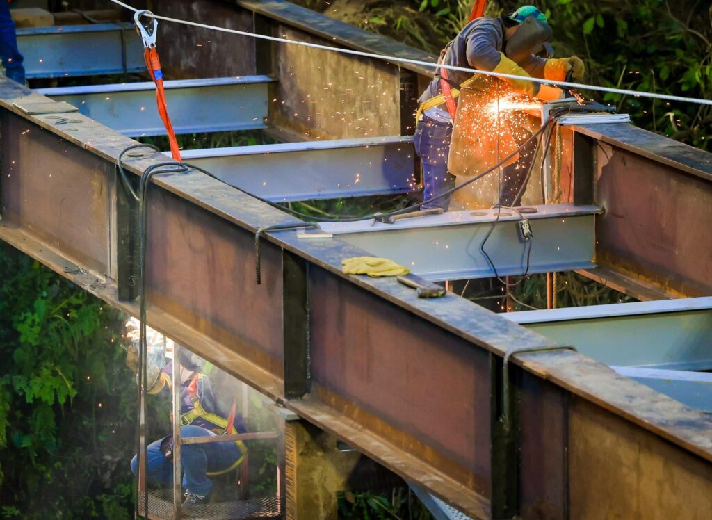 Tras la remoción de la estructura colapsada, los equipos técnicos avanzan con el montaje de la nueva base y vigas, paso previo a la instalación de la tubería de 48 pulgadas ya restaurada.