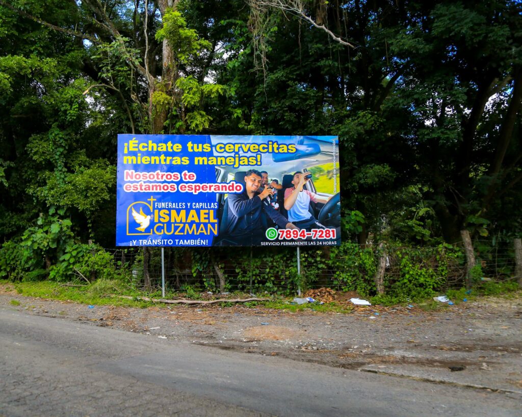 ¡Échate tus cervecitas mientras manejas! Se lee en la vaya en la parte inferior, pero el impacto del mensaje continua con el mensaje que le sigue “nosotros te estamos esperando” se expone como parte de la curiosa  campaña que impulsa Funerales y Capillas Ismael Guzmán.