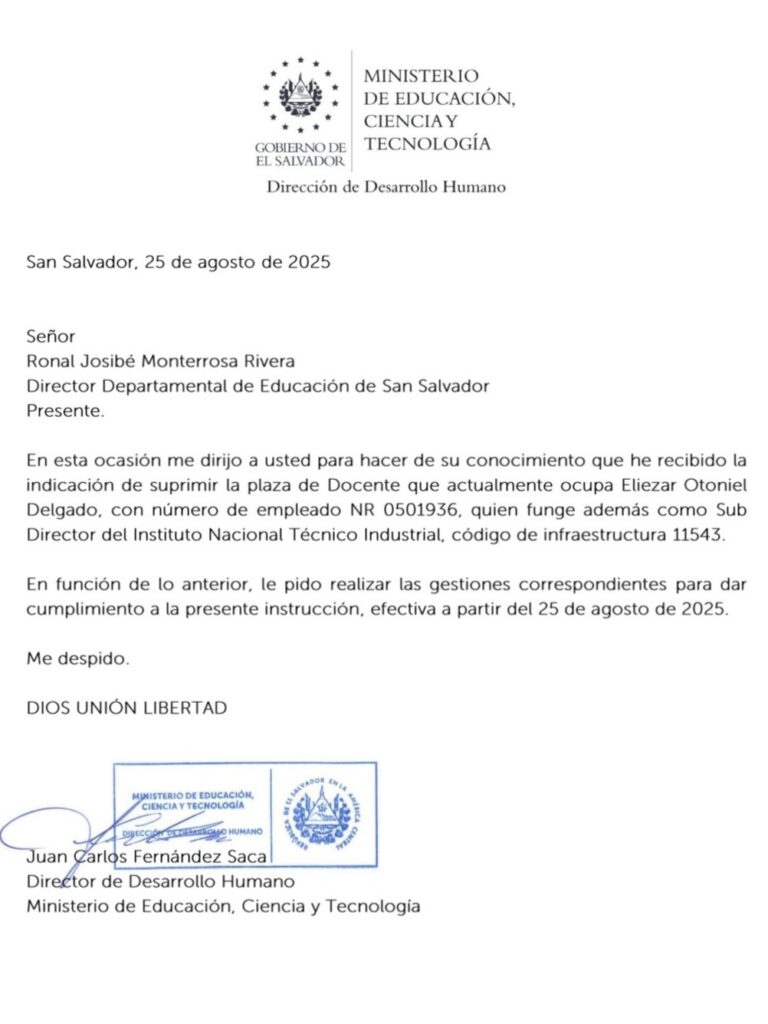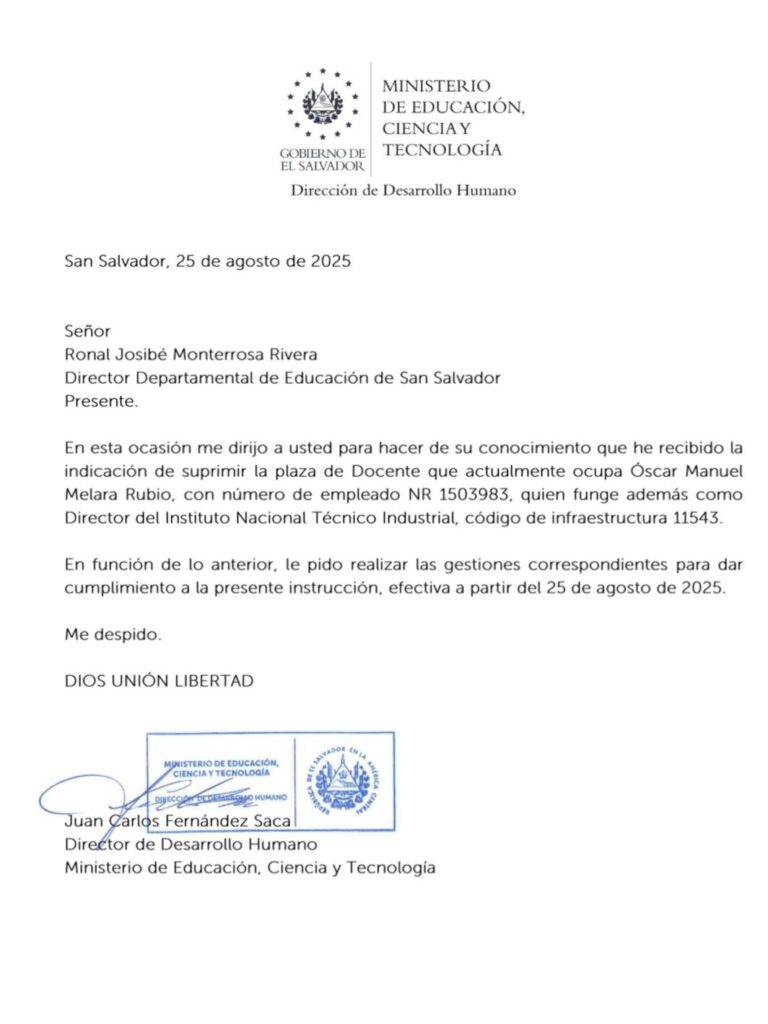 A partir del martes 26 de agosto, los docentes Óscar Manuel Melara Rubio y Eliezar Otoniel Delgado quedan separados de sus cargos como director y subdirector del INTI.