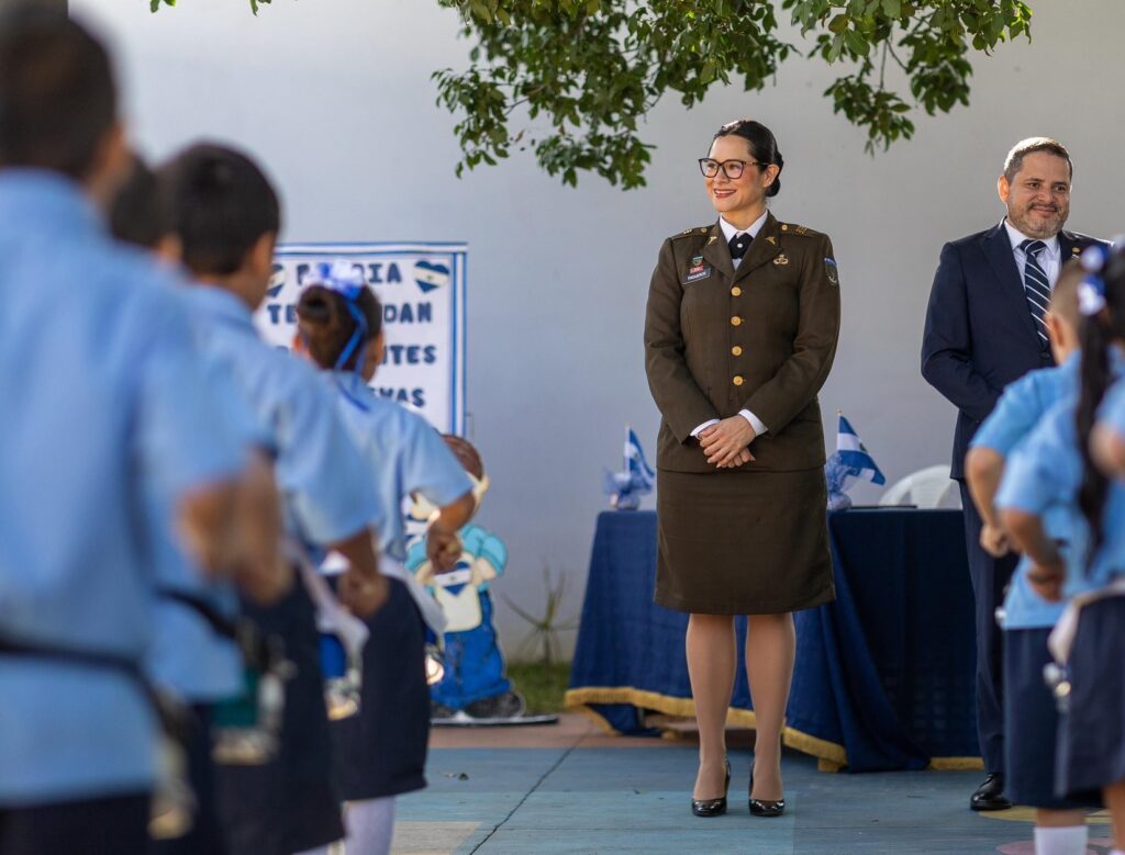 La funcionaria participó en el acto cívico realizado en la Escuela Parvularia Colonia Atlacatl, en San Salvador, donde con fervor y civismo se rindieron honores a la bandera nacional en una ceremonia llena de colorido, que resaltó los símbolos patrios.