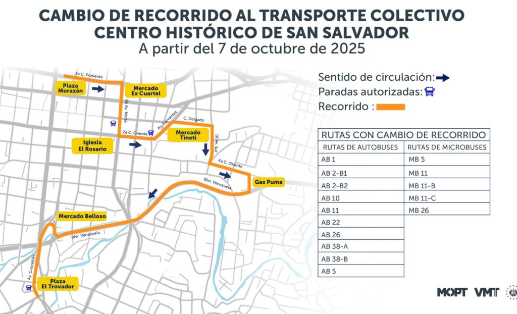A partir de este 7 de octubre, inició un nuevo recorrido de autobuses y microbuses en el trayecto Norte-Sur del Centro Histórico de San Salvador, según anunció el Viceministerio de Transporte (VMT).